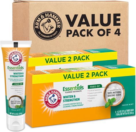 ARM & HAMMER Essentials Whiten & Strengthen Fluoride Toothpaste-4 Pack Of 4.3Oz Tubes, Fresh Mint- 100% Natural Baking Soda- Fluoride Toothpaste