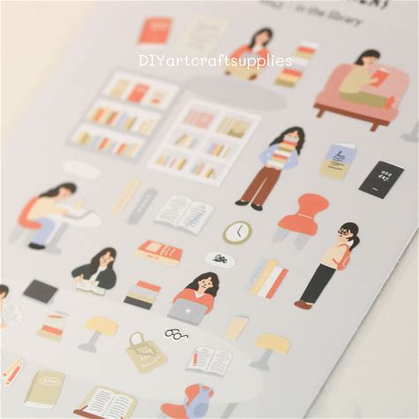 Library Illustration Sticker Sheet, Me In The Library Stickers, Book Stickers, Little Girl Stickers, Kawaii Stickers, Diary Note Stickers