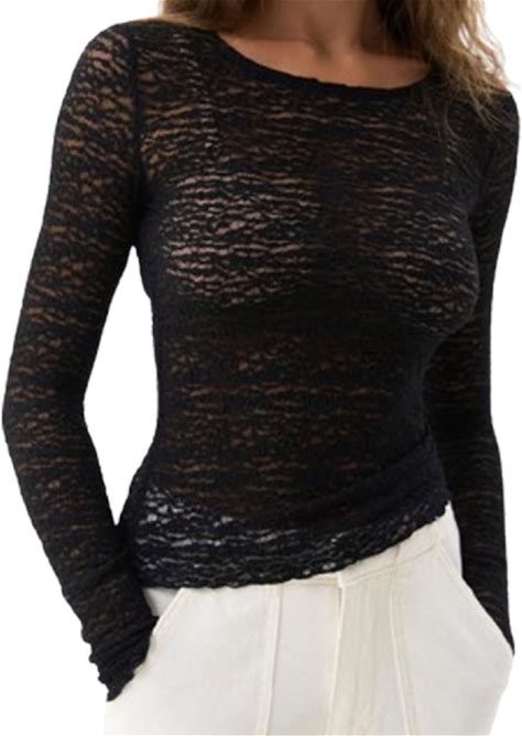 Women Sheer Lace Long Sleeve Tops Floral Lace See Through Layering Top Sexy Sheer Mesh Slim Fit Blouse